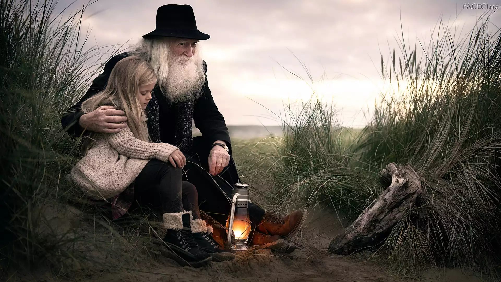 Dziewczynka, Trawy, Dziadek, Lampa - faceci.biz